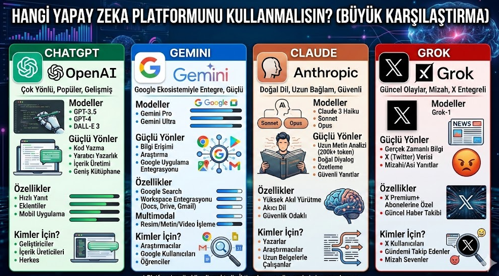 Eğer tek bir platform seçmek zorundaysan ve henüz yeni başlıyorsan: ChatGPT ile başla. En geniş ekosistem, en çok kaynak, en büyük topluluk.
